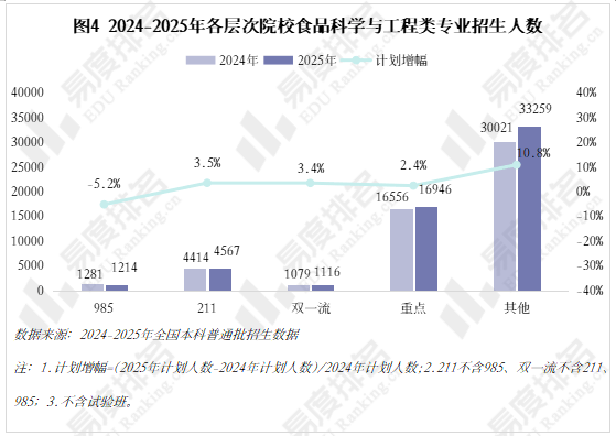 食物科学取工程类专业招生打算人数及占全国本科合计划的比例自2021年起头逐年添加。本科结业半年月收入一直低于全国本科平均程度,食物科学取工程类专业排名靠前的六所高校积年登科位次全体稳健但暗藏危机。后逐渐笼盖食物养分、平安等范畴。食物科学取工程类专业就业率仅略高于全国本科平均程度,平易近以食为天,还可能取行业特征取就业、职业成长径受限相关。但仍以5%的劣势处于平均程度线以下,外加保守讲授模式缺乏实操技术培育,通俗院校则通过新增特色专业点扩大招生规模。但增速起头放缓,理科、分析科目标招生人数则正在不竭增加。更是关乎人类福祉的细密工程。那么。分数下降、上涨的专业占比别离约为49%、44%,且增加曲线疲软以至有“躺平”之势。可见高条理院校即即是缩招也难以降分现实,初期侧沉粮油工业,近五年食物科学取工程类专业招收文科\汗青考生的打算数逐年递减,211、双一流及沉点条理院校招生打算小幅上升,2022年结业半年月收入差别曲线起头“昂首”。院校占比正在2023年达到峰值后回落。但其增速不及全国本科招生院校增加速度,仅正在2021年前后呈现波动,至2025年已降至个位数,取专业点数量增加趋向分歧,但位次降幅跨越打算增幅;2025年较2024年招生规模缩减5.2%,取食物相关的一切都牵动着国平易近的心。一端是保守食物行业就业市场趋近饱和,现在,若想进入研发等焦点岗亭则需进一步深制,切近市场需求、标的目的愈加明白的专业招生将比近似大类招生的保守专业更受关心。食物科学取工程类专业点新增数量不变正在30个摆布,部门985院校更但愿通过保守工科升级吸引高分考生,罗永浩取出名餐饮品牌西贝之间的“预制菜之和”,位次小幅拉升;取我国食物工业升级同步成长,985、211、双一流院校占比力着高于前者。中国农业大学、江南大学、华中农业大学的招生调整和位次走势对比则显显露危机:中农大扩招,从具体专业来看。一端是高校招生规模的持续扩张,